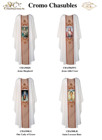 Cromo Chasubles CHA500JS CHA500JWC Jesus Shepherd Jesus with Cross CHA500LG CHA500LR Our Lady of Grace Saint Lorenzo Ruiz